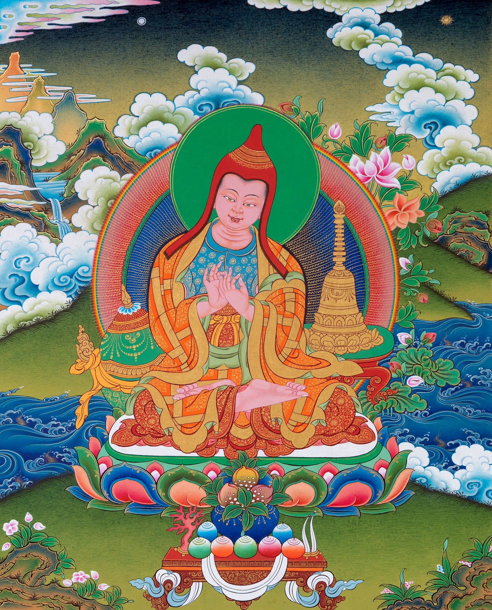 Atisha then filled a precious vase, transparent from the outside, with gold, silver, pearls, corals, and lapis lazuli, and offered it to Lama Serlingpa.